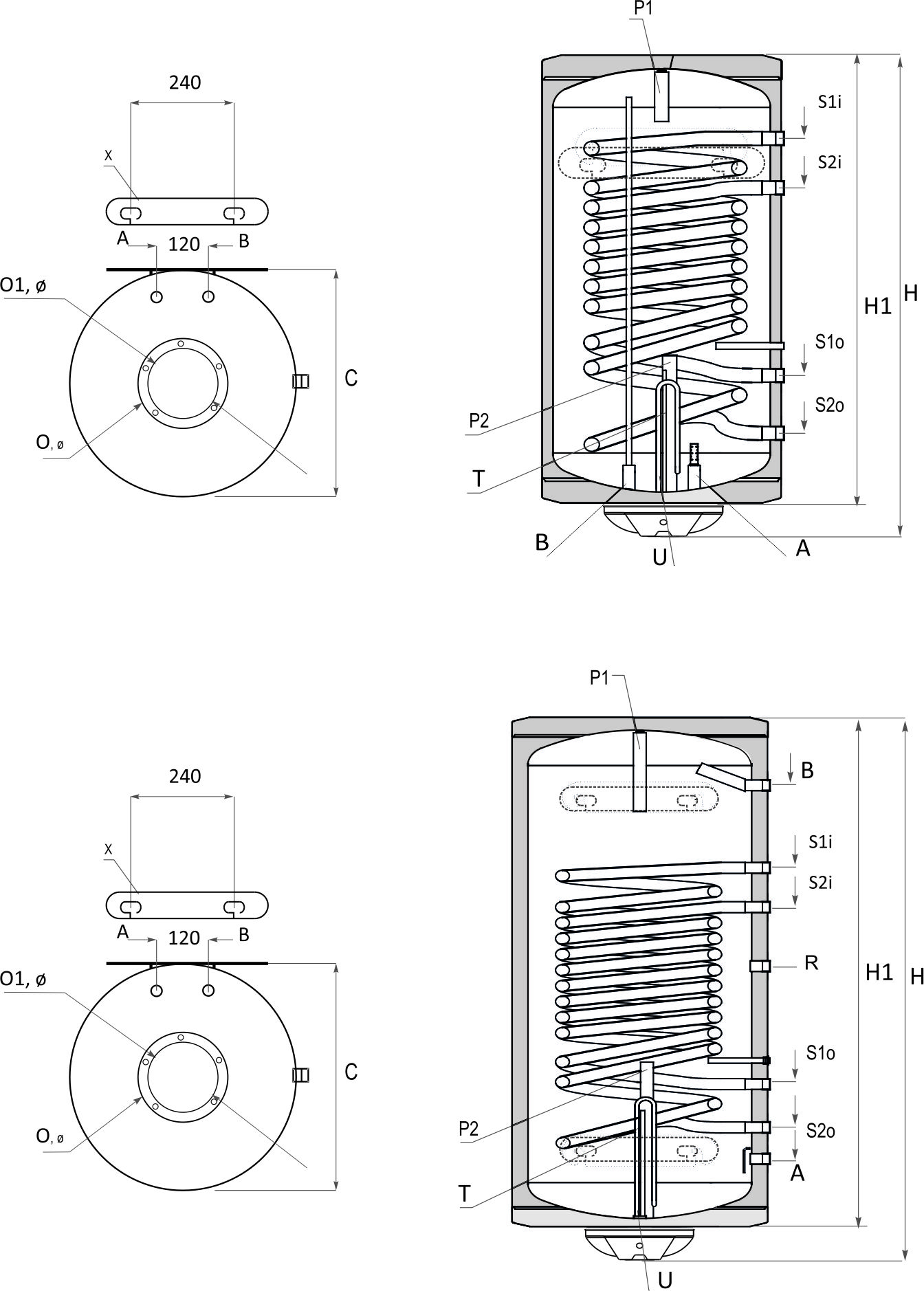 | Вход/изход горна серпентина S2, S2i/ S2o, mm, Rp3/4” | 410/260 | 810/360 |